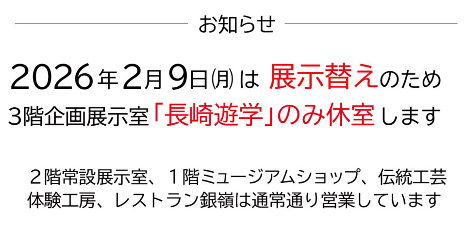 2026年02月08日お知らせ2026年2月9日(月)は、3階企画展示室「長崎遊学」のみ休室します